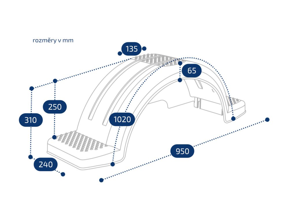 - Přední, zadní a horní plocha s povrchem s výstupky určená k našlápnutí. Při uchycení blatníku přední a zadní nášlapnou plochou na dostatečně tuhé držáky je testované statické zatížení horní nášlapné plochy bez dalšího podložení min. 90 kg.