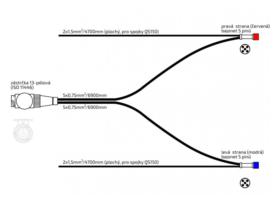 - Z třináctipólové zástrčky jsou vyvedeny dvě větve pětižilových kabelů 5x0,75 mm2 (levá a pravá) o délce 6900 mm.