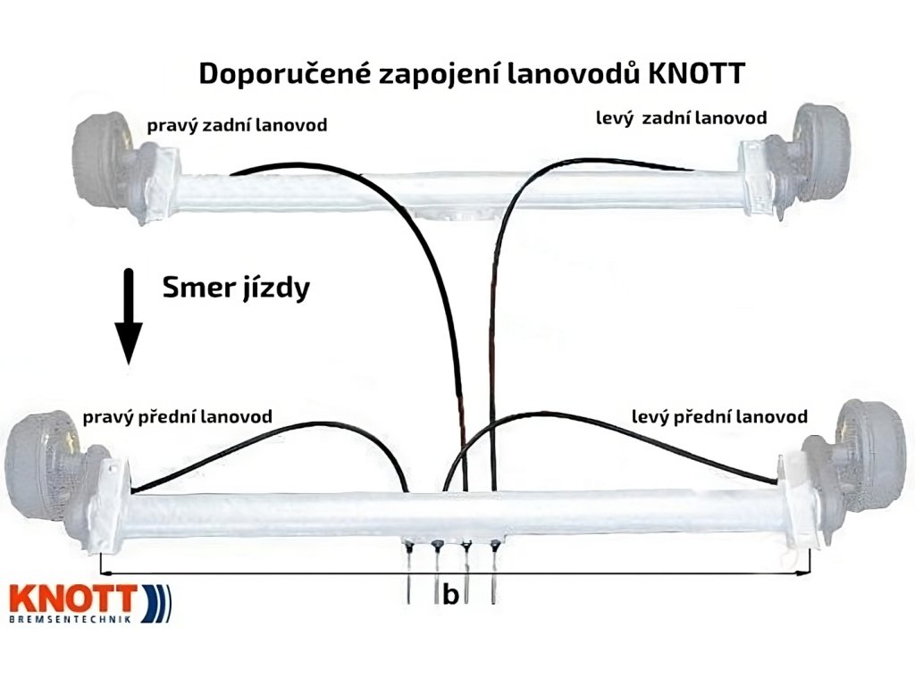 - Pro dvounápravové přívěsy doporučuje KNOTT tzv. asymetrické zapojení lanovodů, kdy je přední náprava zapojena na jedné straně tandemového vahadla a zadní náprava je zapojena na druhé straně. To např. v případě vytržení jednoho lana při nehodě zajistí lepší symetrii brzdění zbylých kol.