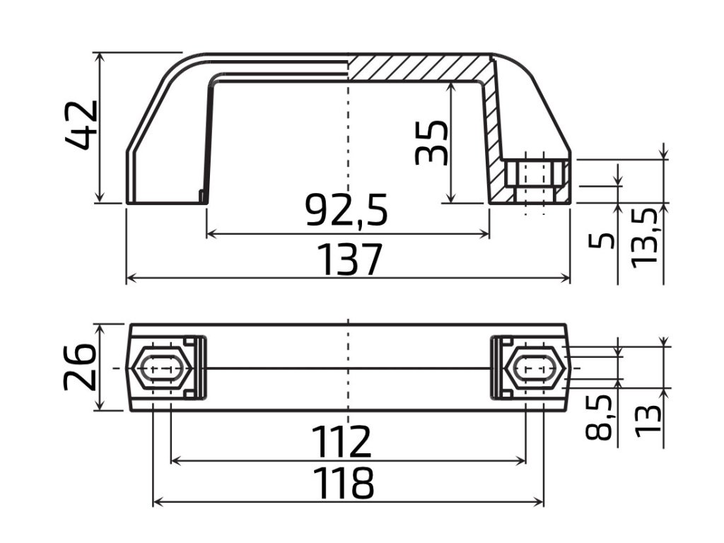 - Celková délka madla je 137 mm, vnitřní délka úchopu 92,5 mm s bohodlnou světlostí úchopu 35 mm.