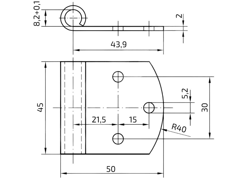 Pouzdro pantu pro čep 8 mm s plochým úchytem. Vyrobeno z plechu o tlouštce 2 mm s třema předvrtanými otvory 5,2 mm.