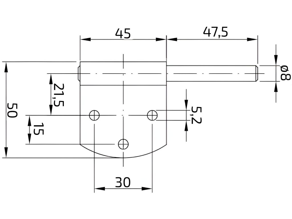 Čep pantu s plochým úchytem (průměr čepu 8 mm). Vyrobeno z plechu o tlouštce 2 mm s třema předvrtanými otvory 5,2 mm