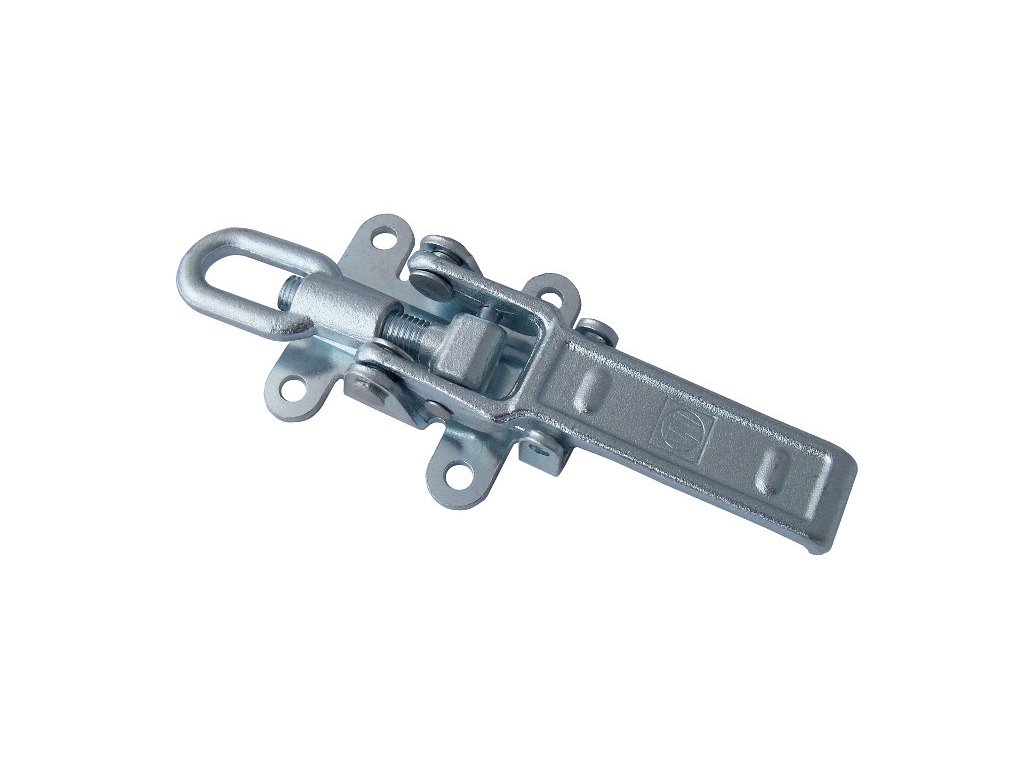 Robustní litinová přeska EXZV 10-2 se stavitelným okem, použitelná k zajištění sklopných nástaveb přívěsů.
