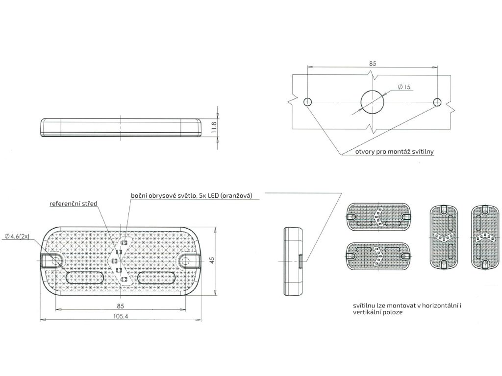Boční obrysová svítilna v LED provedení s integrovanou odrazkou. Svítilna je dodávána včetně snadno demontovatelného plastového držáku. Homologace umožňuje montáž svítilny s držákem i bez, ve vertikální i horizontální poloze.Doplňkové parametry
