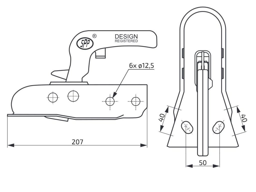 - Tažná kulová spojka SPP (tzv. žehlička) pro nebrzděné přívěsy s V-ojí do nejvyšší povolené hmotnosti přívěsu 750 kg.