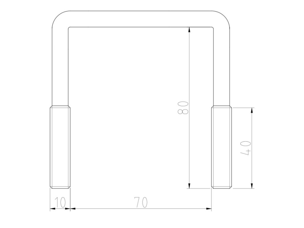 Ocelový galvanicky pozinkovaný třmen se závity M10. Závity jsou na třmenu tzv. naválcované, t.j. délka závitu je pevně daná a závit nelze proříznout dál. Průměr kulatiny třmenu je 9 mm.