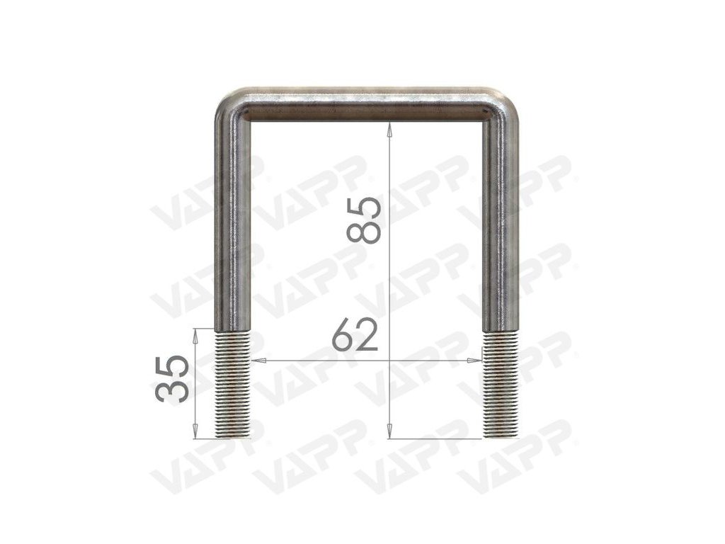 Ocelový galvanicky pozinkovaný třmen se závity M10. Závity jsou na třmenu tzv. naválcované, t.j. délka závitu je pevně daná a závit nelze proříznout dál. Průměr kulatiny třmenu je 11 mm.