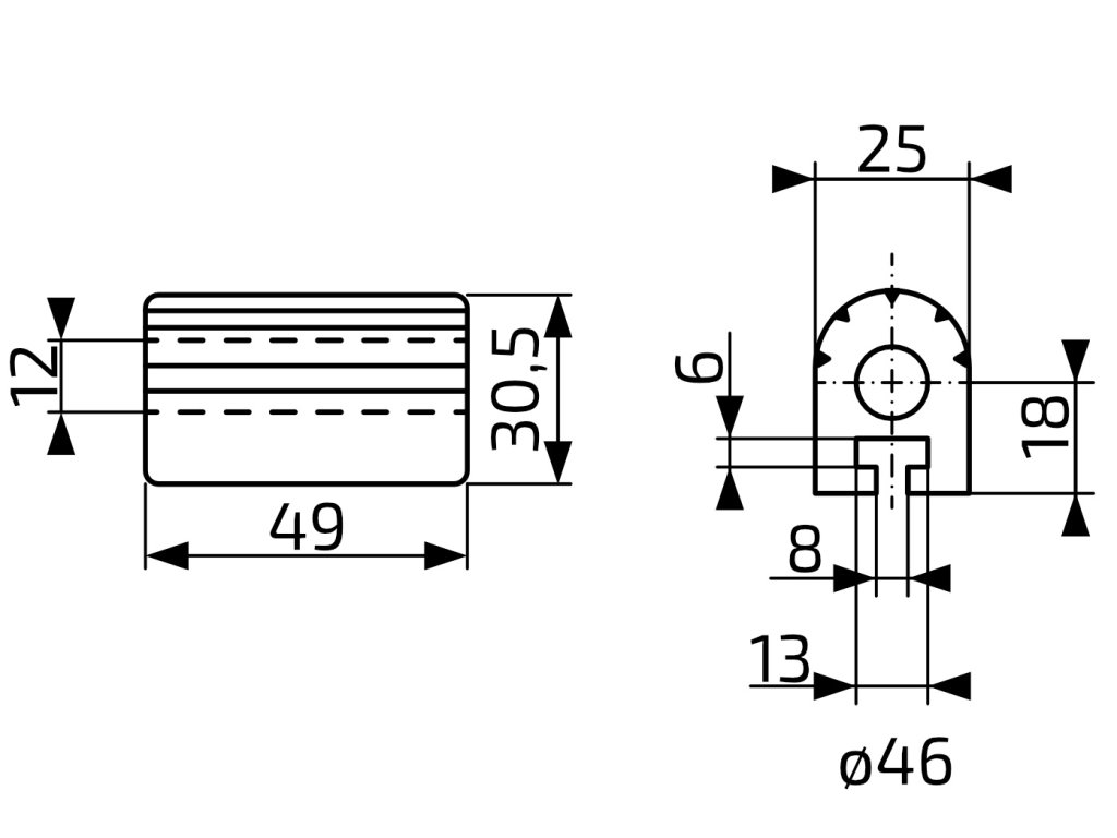 Uložení pantu bočnic používané na sklopný přívěsech VAPP P3S, P1S a PVS. Otvor pro čep pantu průměru 12 mm