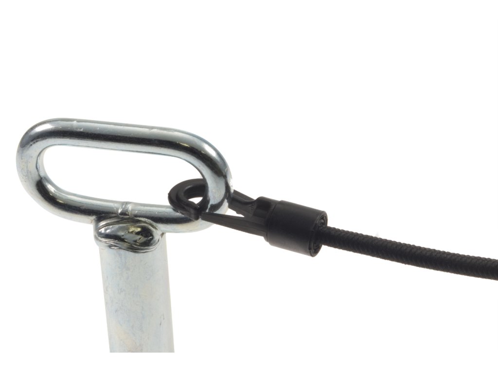 - Pružné gumové lanko s opletem a dvěma plastovými karabinkami pro zajištění křídlových matic nájezdů na přívěsech VAPP