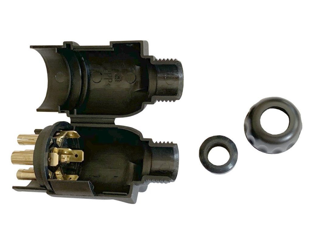 - Kvalitní značková sedmipólová zástrčka Erich Jäger pro přívěsy s připojením vodičů pomocí plochých konektorů
